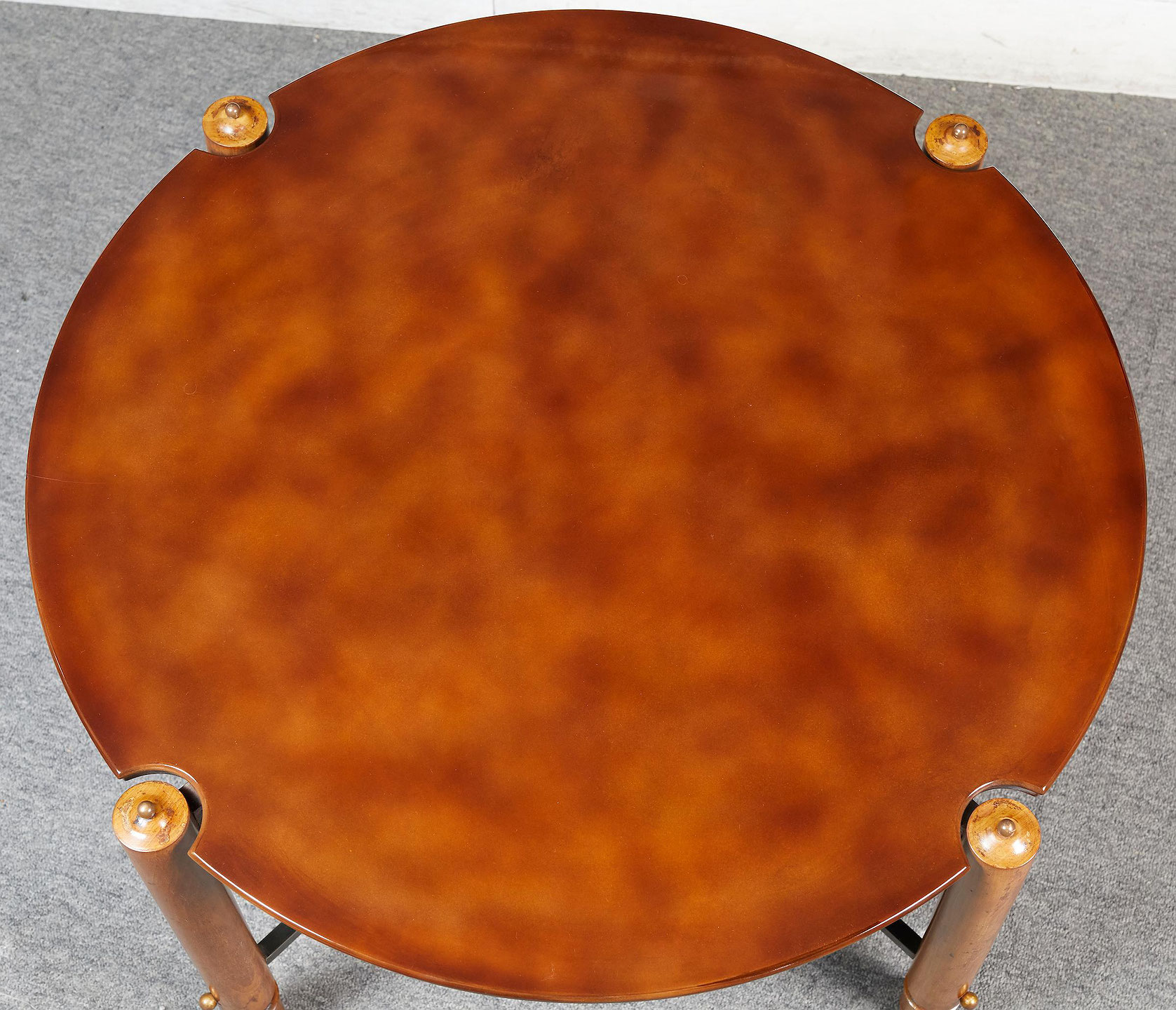 Circular brown lacquered wood "lacque nuagé" low table by Jules Leleu resting on four oak legs joined by a patinated bronze "X" form stretcher. Signed on paper label to underside : Jules Leleu, inventory number 28030, dated 22 march 1956. France: circa 1956 Reference: Leleu Decorateurs Ensembliers by Francoise Siriex , pages 253, 254,257. France.