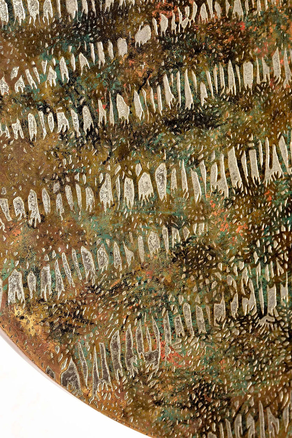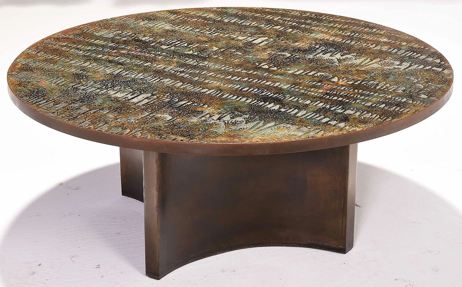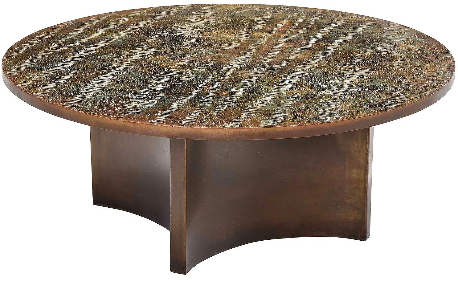 Rare engraved and acid-etched, patinated and polychromed bronze, pewter and enamel "Eternal Forest" Coffee table by Philip & Kelvin Laverne . The beautiful decorated and patinated top is resting on a four sided concave patinated brass plinth base. Etched signature to top "Philip + Kelvin Laverne". USA : circa 1960 Philip (1907-1987) and Kelvin (b. 1937) LaVerne were a New York-based father and son collaborative duo best known for their use of innovative metalworking techniques to produce custom-made, limited editioned furniture which integrated art and design. Born in New York City, Philip LaVerne studied under Ashcan School painter John Sloan at the Arts Students League of New York. Kelvin LaVerne, also born in New York, pursued metal sculpting and furniture design at the Parsons School of Design and, like his father, studied at the Arts Students League as well. In the late fifties, the two began collaborating, eventually opening a showroom on East 57th Street in Manhattan. Working primarily in pewter and bronze, Philip’s role concentrated on the materials and decorative elements, while Kelvin focused on the overall form and functionality. Combining modern and traditional designs, their subjects centered mostly around historical civilizations, mythology, and chinoiserie, later gravitating towards more abstracted works. Patterns range from the figural, like “Chan”, “Ming” and “Festival” to the abstract, such as “Eternal Forest”, “Viola” and “Etruscan”. Since Philip’s death in 1987, Kelvin has ceased production of their famed Historical Series, however, he still creates pieces under both their names to this day.
