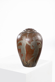 Hammered brass vase decorated with silver figures and foliage on a copper background. Signed "P.Mergier". France: circa 1930