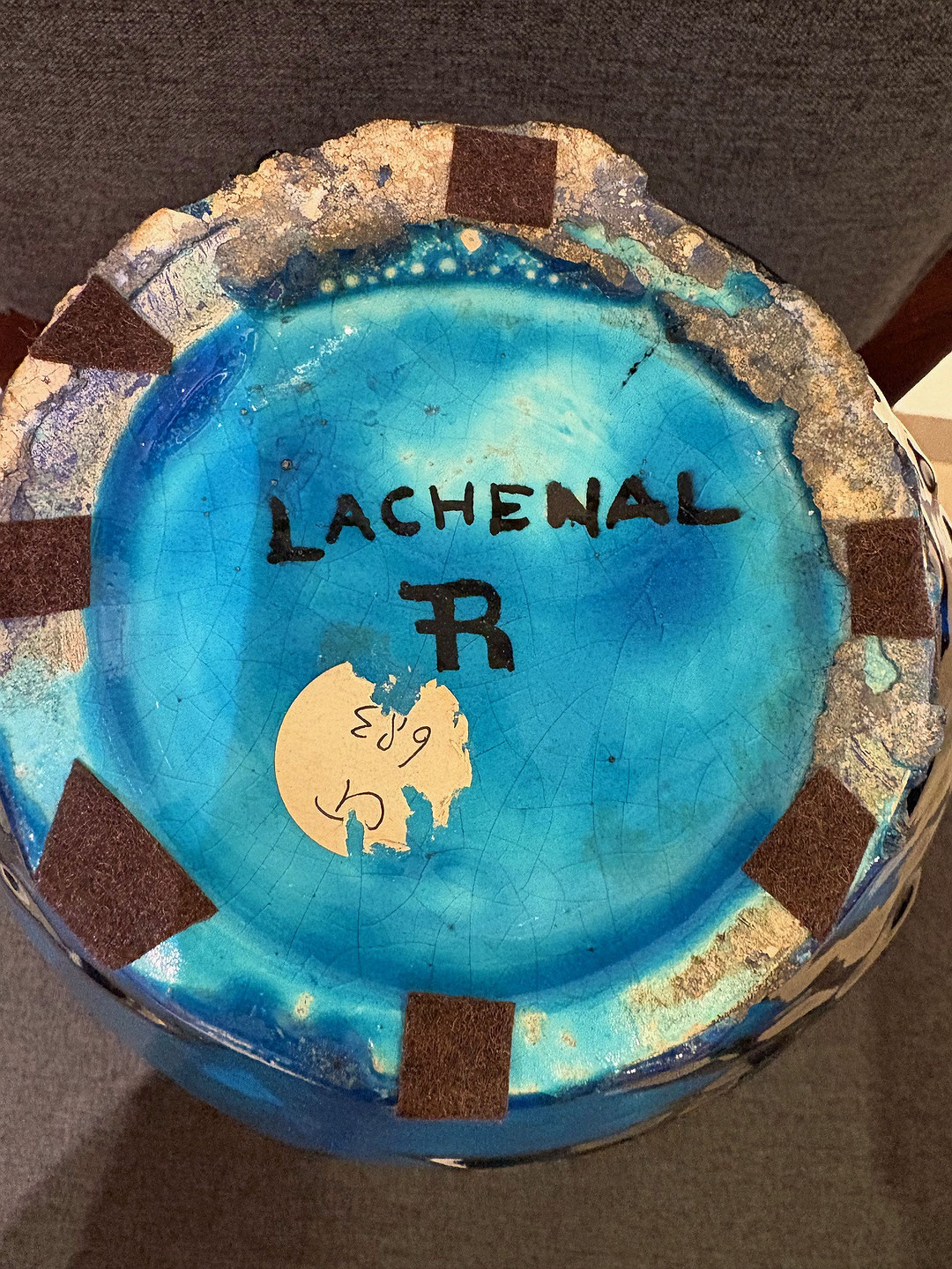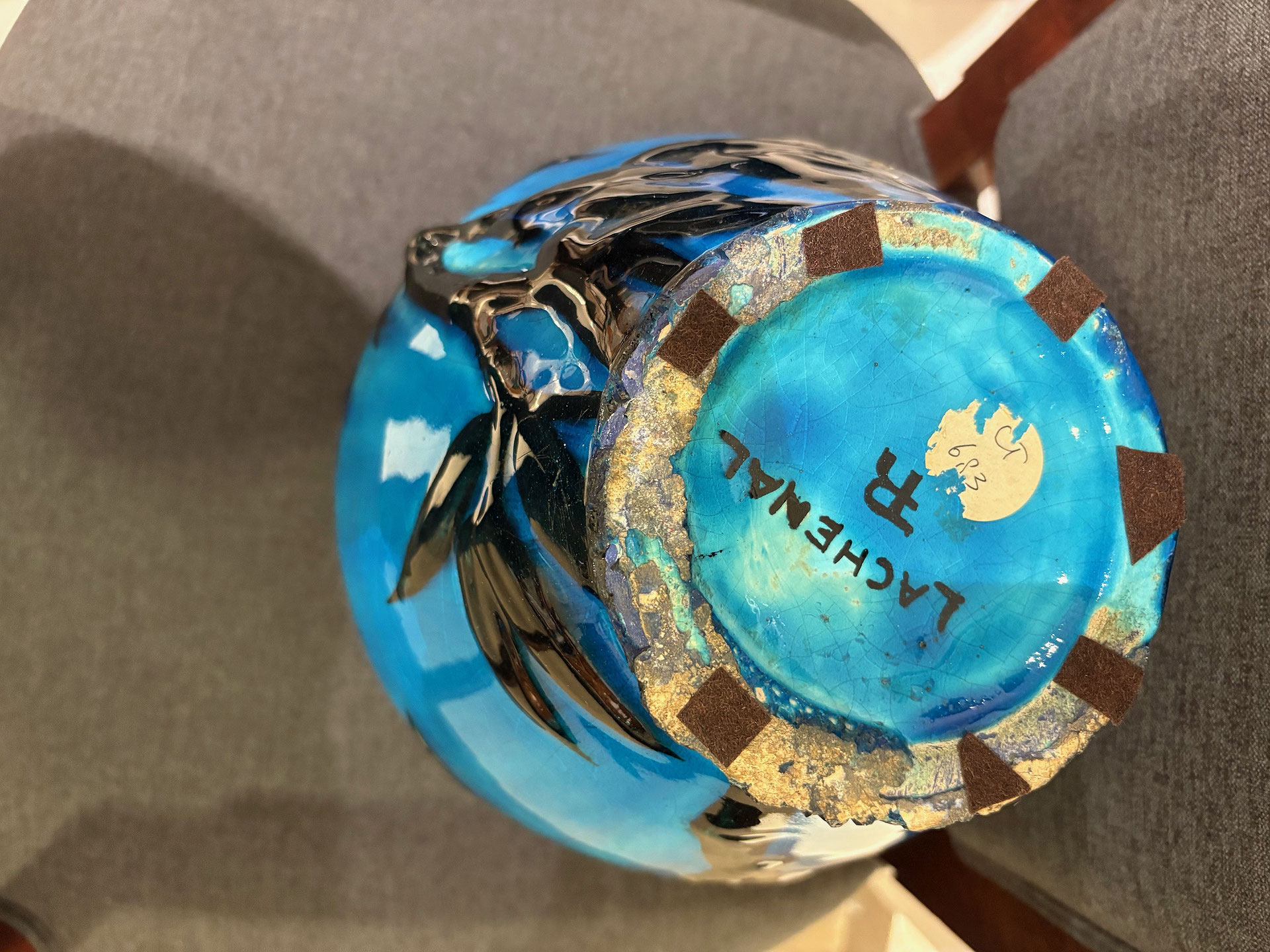 Raoul Lachenal (1885-1956), "Egyptian" blue glazed ceramic "Bamboo" vase by Raoul Lachenal. The relief black glazed bamboo decoration over a typical turquoise blue glazing. Signed: "Lachenal R". France: circa 1915-1920 Private Collection, Amsterdam Christie's, Amsterdam, 15 November 2000, lot 125 Acquired from the above by the present owner A. Duncan, The Paris Salons, 1895-1914, Volume IV: Ceramics & Glass, Woodbridge, Suffolk, 1998, p. 268 M. Eidelberg, Edmond Lachenal & His Legacy, exh. cat., Jason Jacques Gallery, New York, 2007, p. 22, fig. 12, 64-65, no. 4 P. Arthur, French Art Nouveau Ceramics, An illustrated Dictionary, Paris, 2015, p. 228
