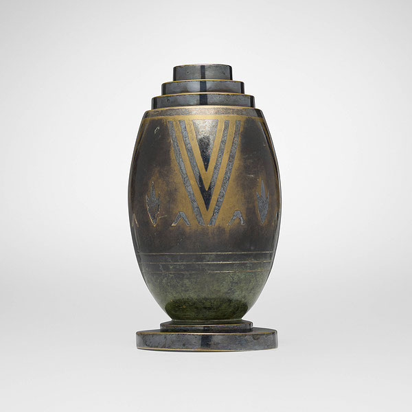 Inlaid and Patinated Metal Art Deco Dinanderie Vase by Luc Lanel for Christofle Impressed manufacturer's mark and number to underside ‘Christofle 242 E’. France circa: 1925