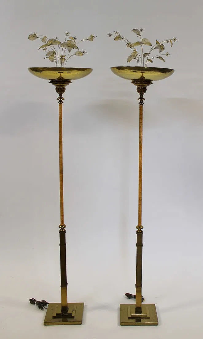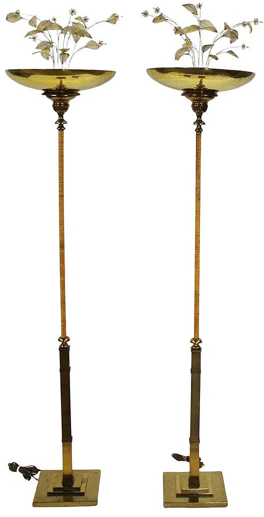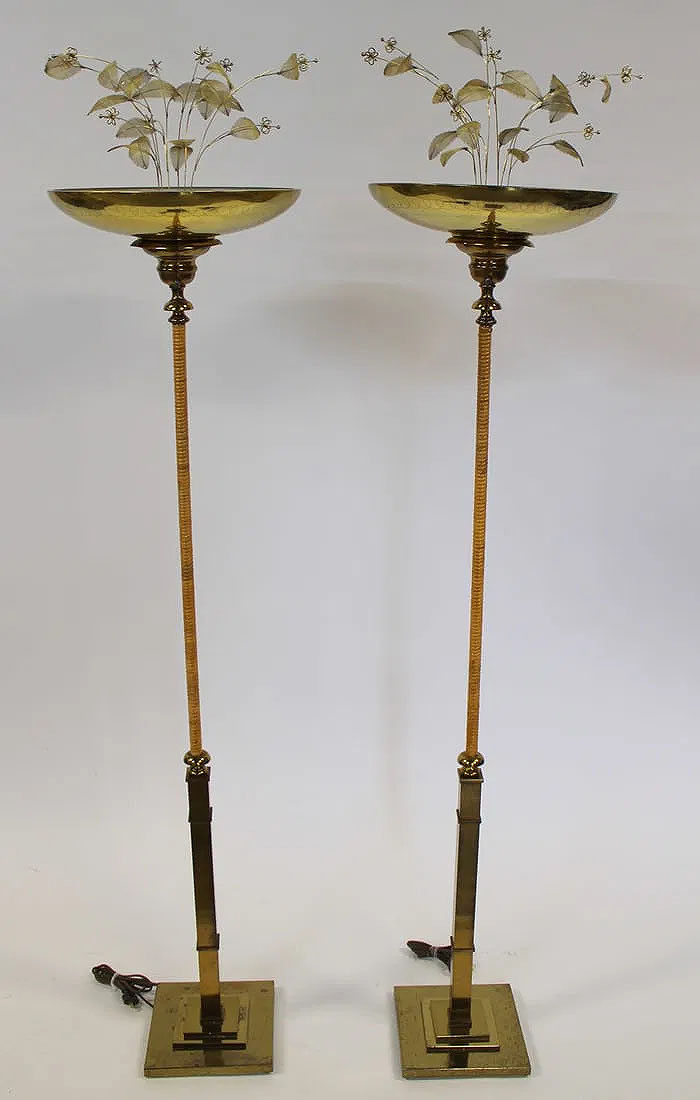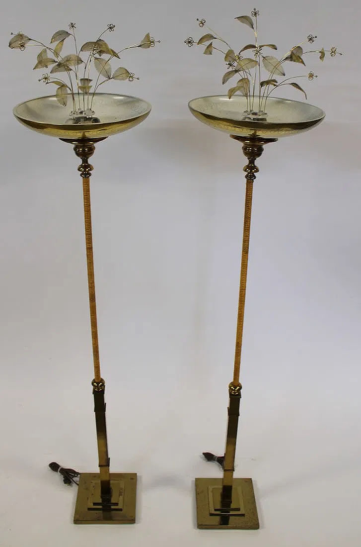 Pair of brass and rattan floor lamps by Paavo Tynell decorated with fretwork leaves. Finland: circa 1970