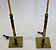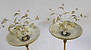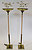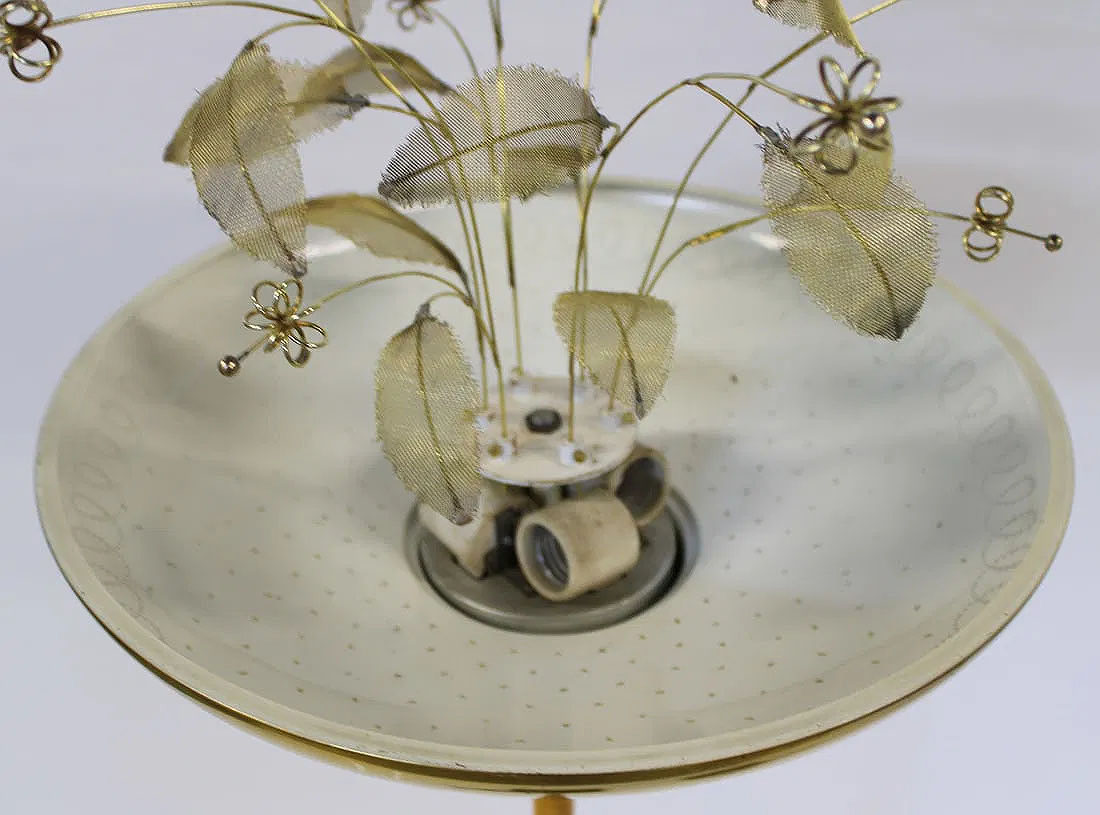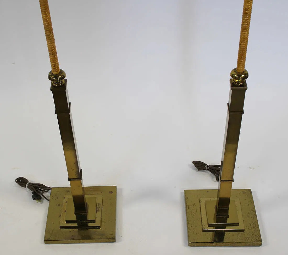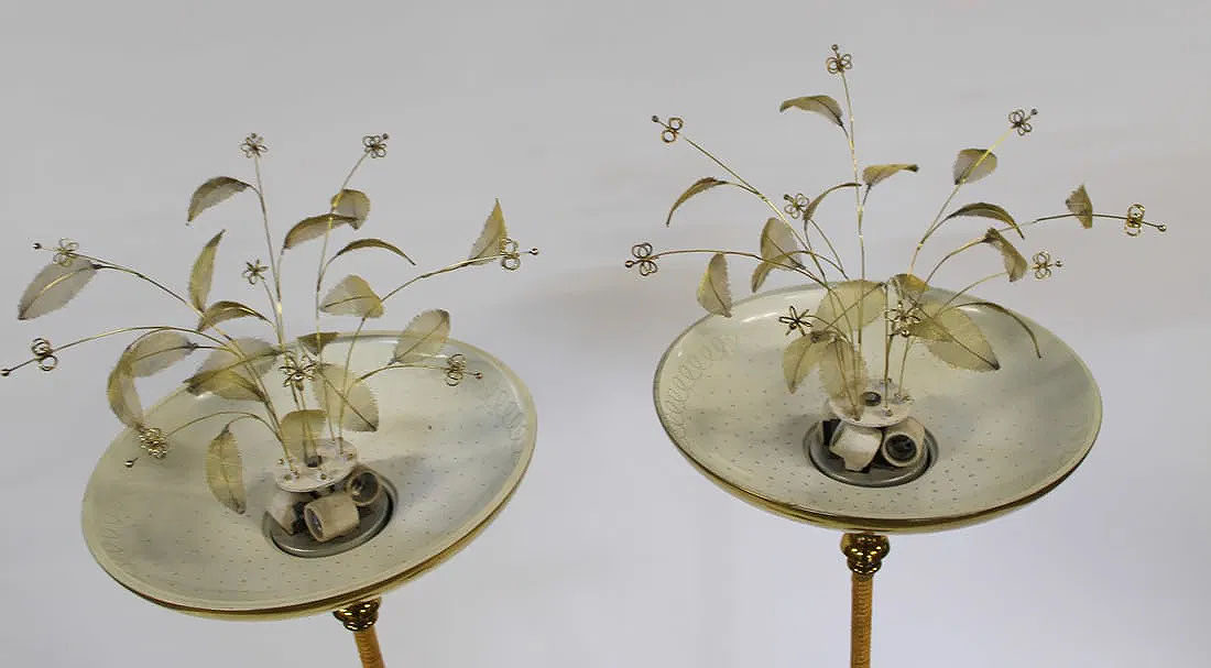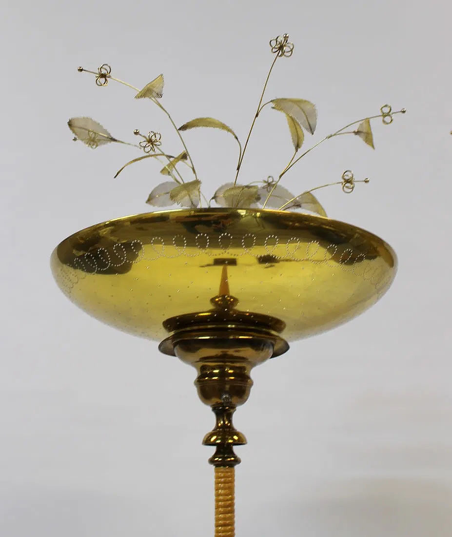 Pair of brass and rattan floor lamps by Paavo Tynell decorated with fretwork leaves. Finland: circa 1970