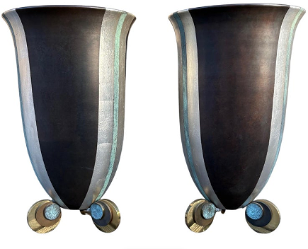 Important pair of Art Deco style urns by Karl Springer in brown patinated brass with applied silver leaf and vers de gris patination vertical linear motif. Karl Springer was very much influenced by the great Art Deco designers from the 1930's-40's like Jean Michel Frank and Jean Dunand, we can certainly notice the influence of Jean Dunand in the workmanship of these urns. Karl Springer was born in Berlin, Germany in 1931and in 1957 he immigrated to New York USA 1980