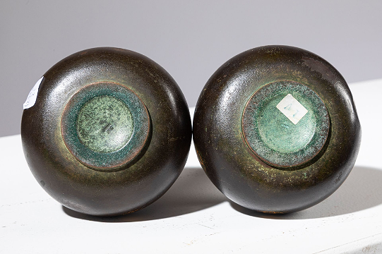 Pair of bronze soliflore vases by Christofle with a bulbous body and flared neck, decorated with stylized flowers Signed "Christofle" and numbered. France: circa 1925