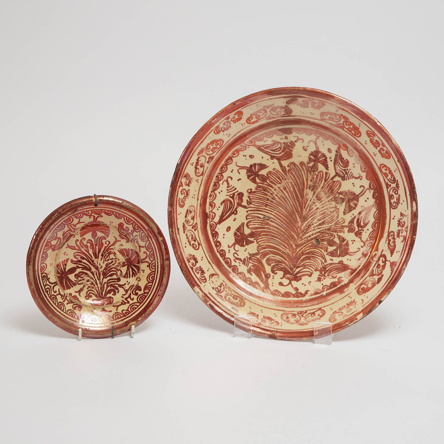Two Hispano-Moresque Tin Glazed Copper Lusterware Dishes, each with central stylised floral motif with stylised waves in the banded border smaller diameter 7.3 in