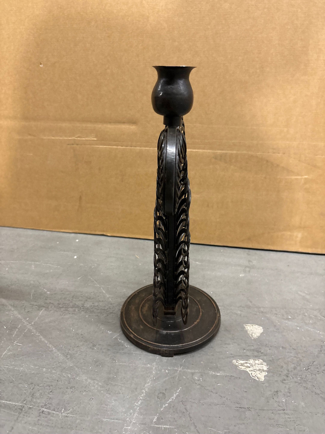 Rare pair of wrought iron candelabras by Edgar Brandt, "Les Plumes" . Impressed signature to top of base on each example ‘E Brandt’. Provenance: Historical Design, New York | Richard Lee Interior Design, Inc., New York | Acquired from the previous in 1999 by the present owner